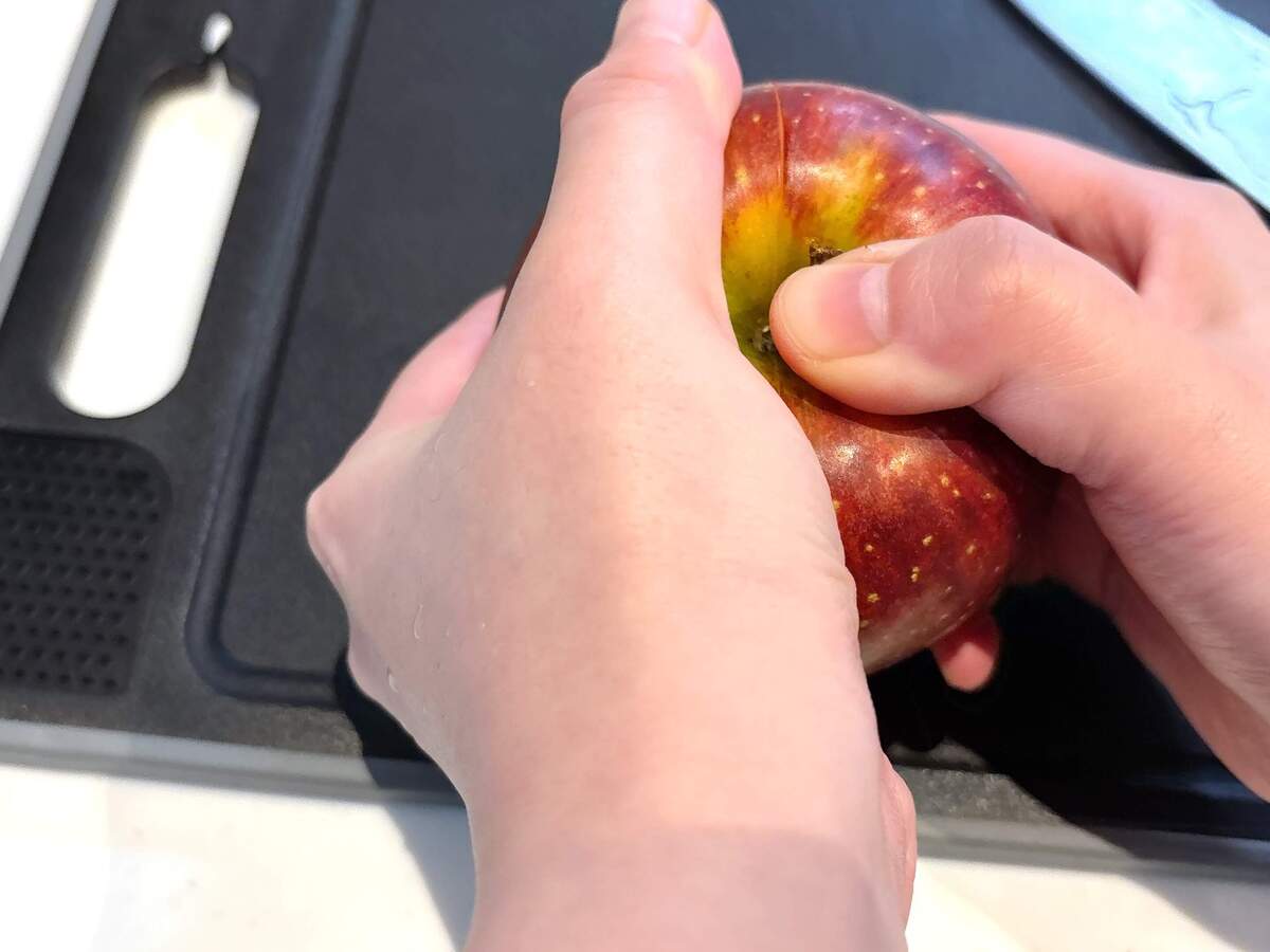 仕方がないので、りんごに包丁で切れ目を入れてトライ!もはや裏ワザではないかもしれませんが、手でパカッと割ることが目標です(笑)。