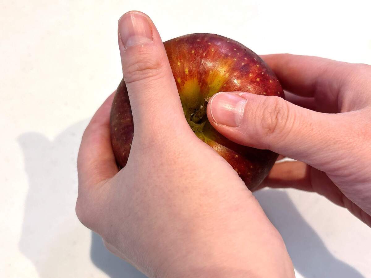手順2.りんごのヘタ部分に、左手の親指の付け根を重ねて割る