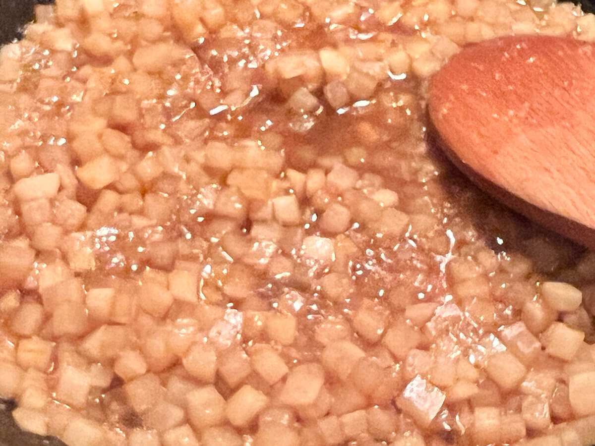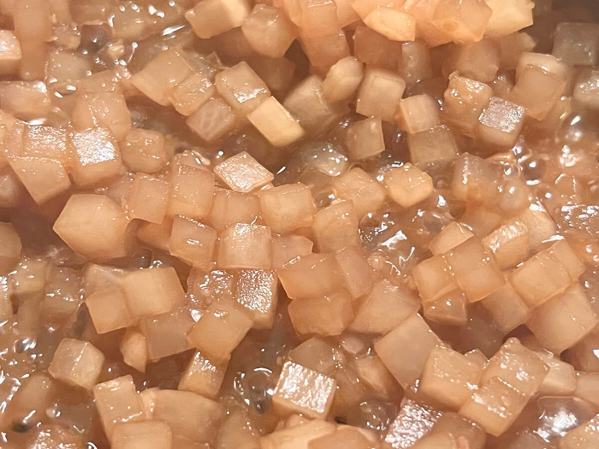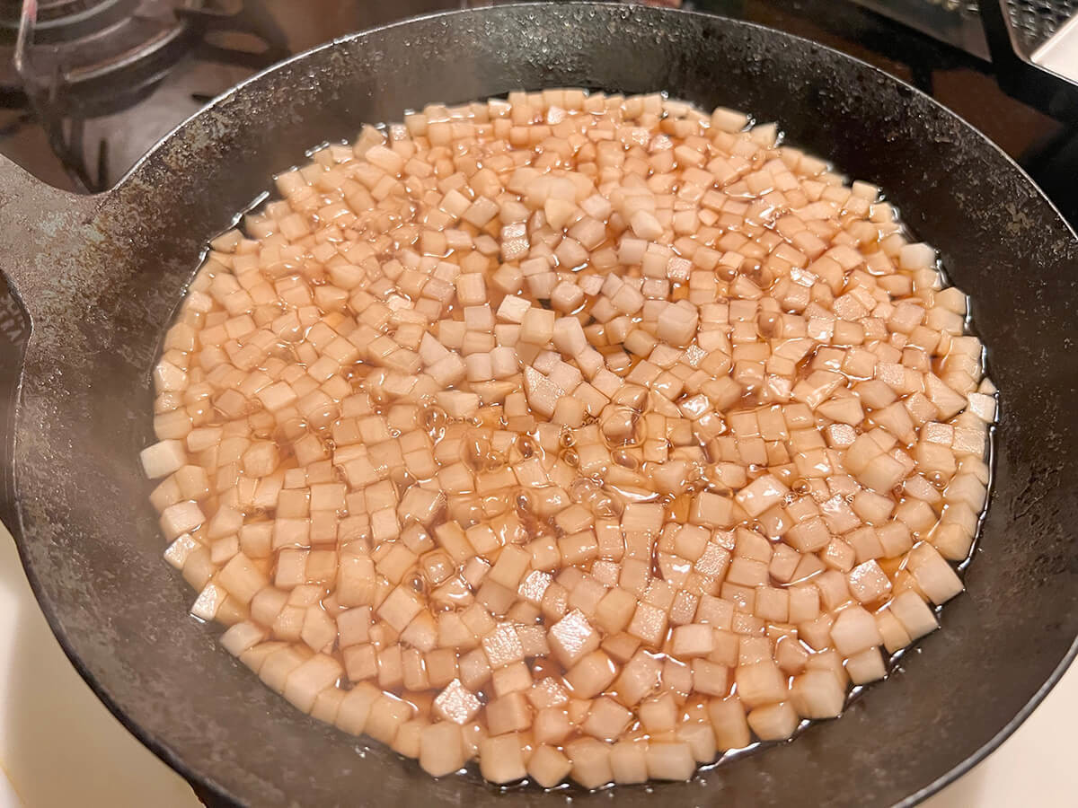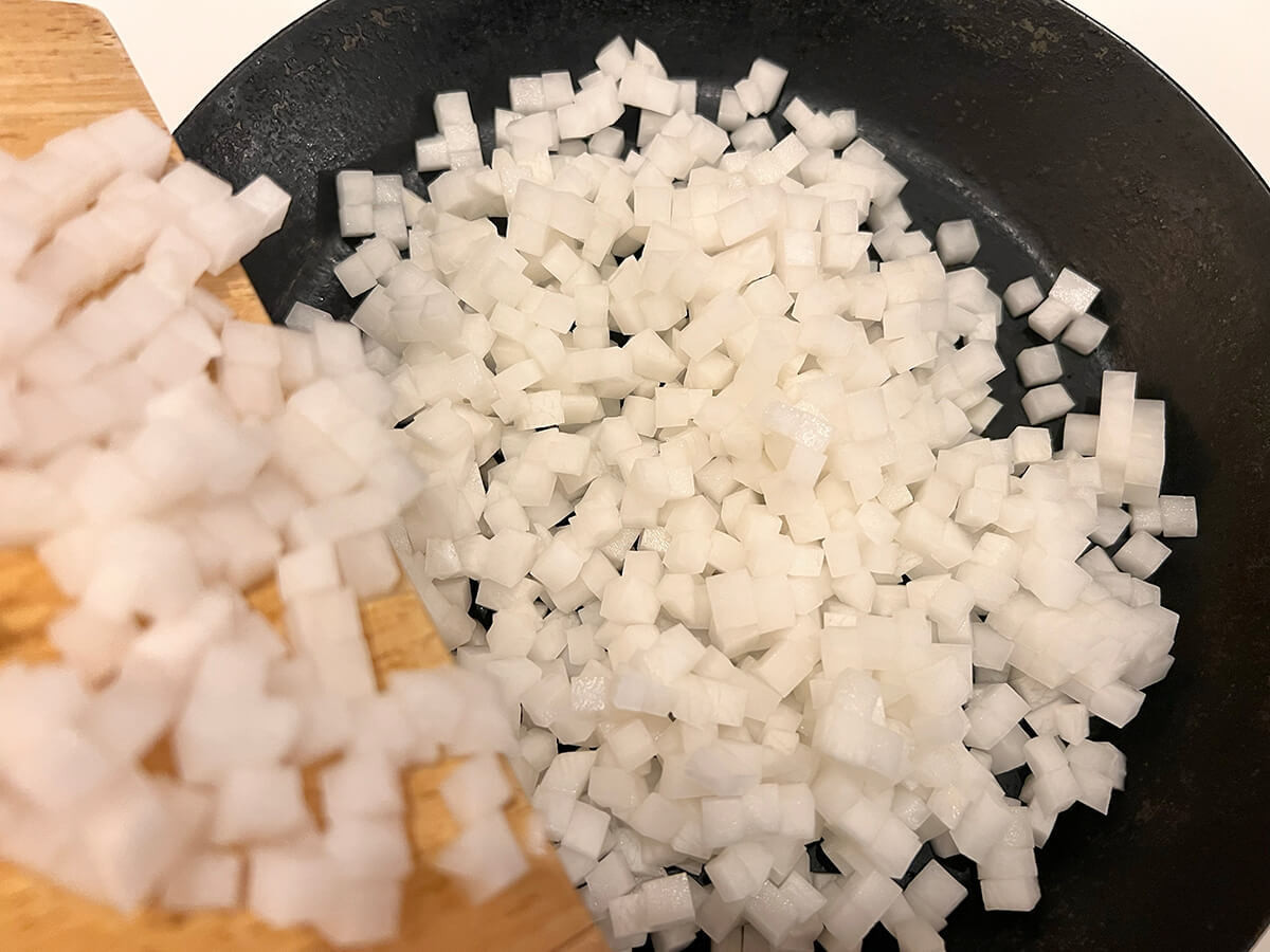 大根を小さい角切りにしてフライパンに入れます。このくらいには切ってね、とおっしゃっていたのがおそらく6〜7mm角のように見えたので、そのくらいに切りました。