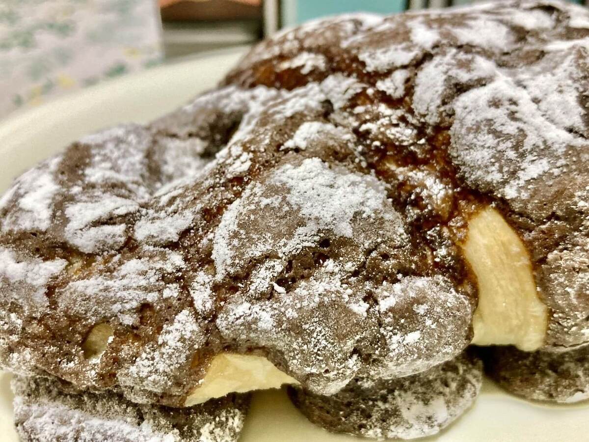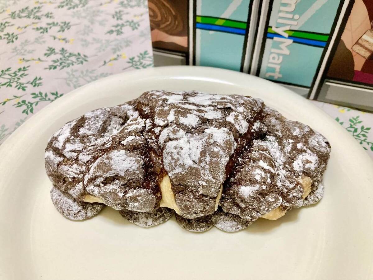 ココア生地のクロワッサンドーナツに、チョコクリームとチョコホイップがサンド。