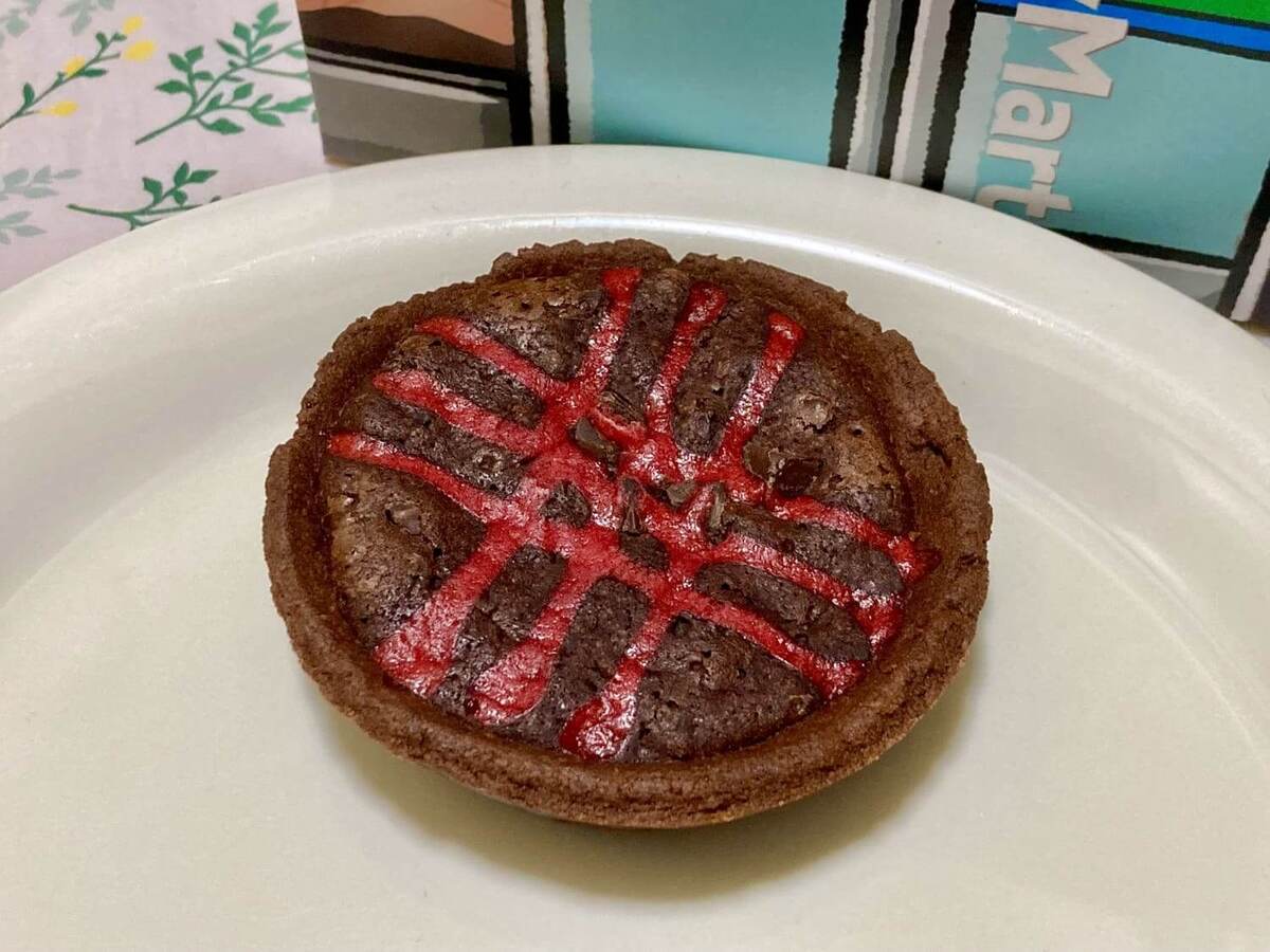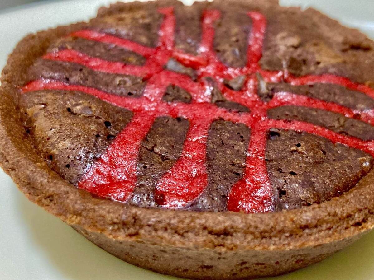 チョコタルトにラズベリー香るチョコ生地とキューブチョコを加え、甘酸っぱいラズベリーソースをかけて焼き上げたタルトです。
