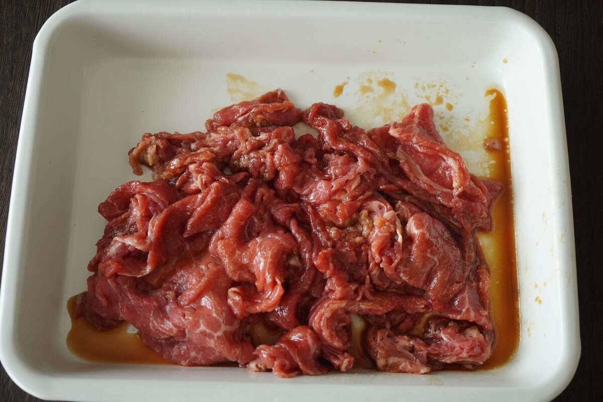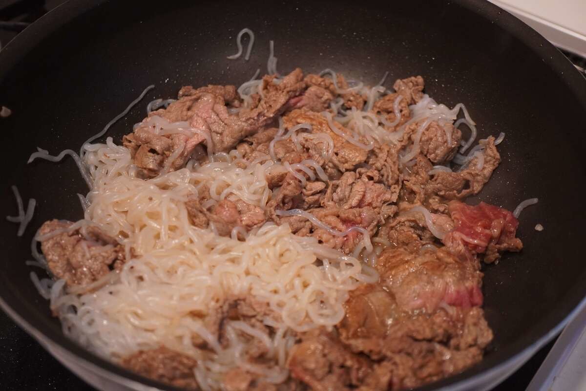 同じフライパンに下ごしらえした牛肉を入れて強めの中火にかけ、肉の色がほぼ変わるまで炒めます。