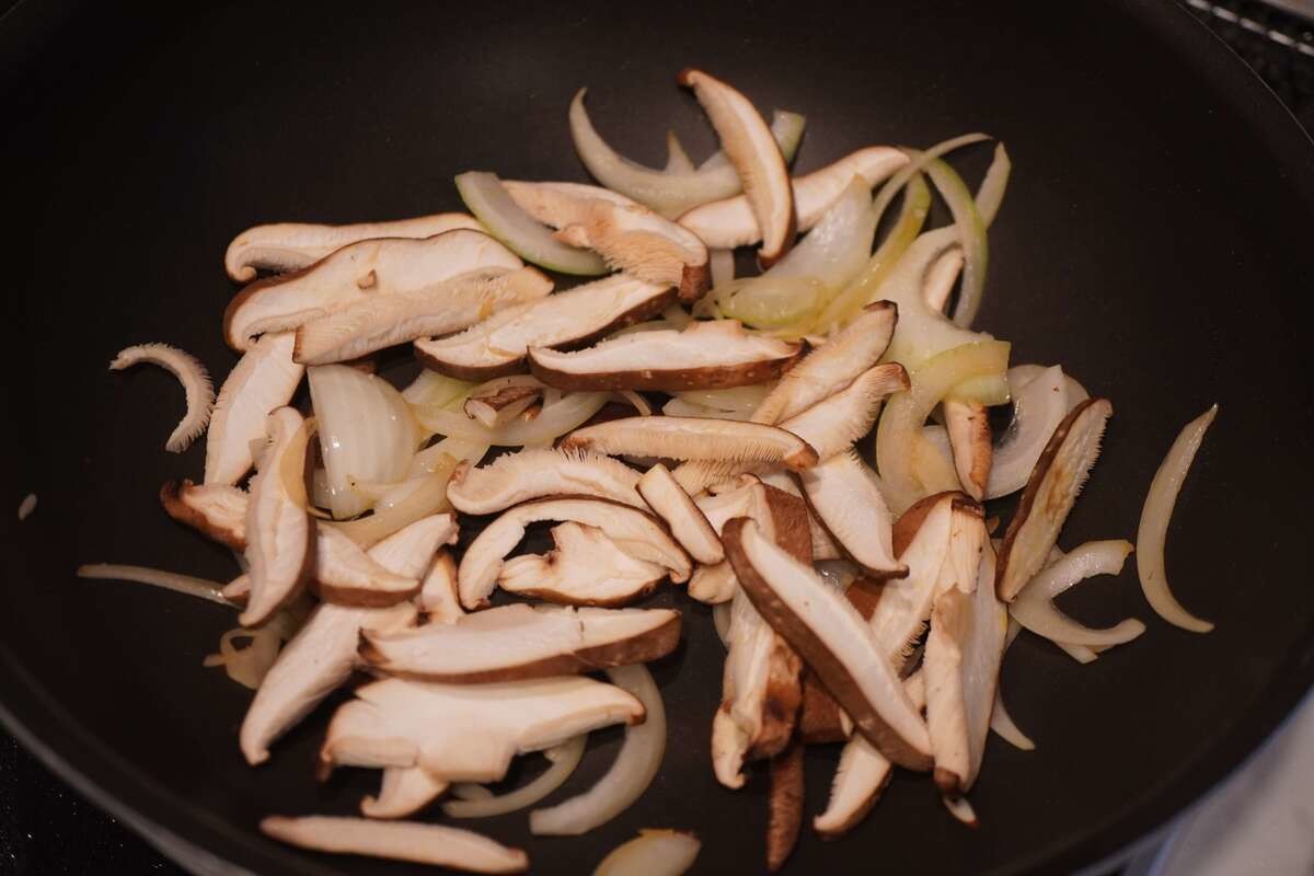 椎茸を加えて火が通るまで炒め、塩、こしょう各少々を加えて混ぜ、にんじんが入ったボウルにとり出します。