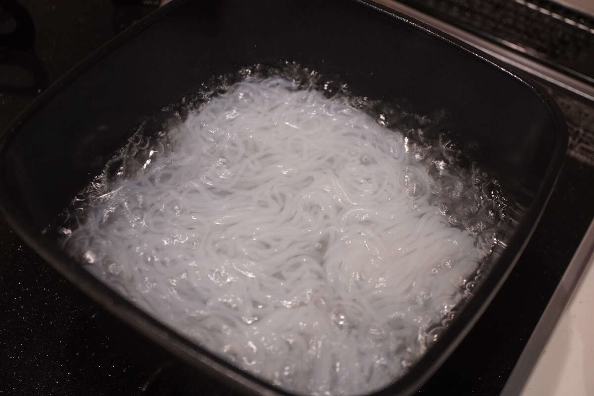 しらたきは水気をきって鍋に入れ、かぶるくらいの水を注ぎ、強火で熱します。