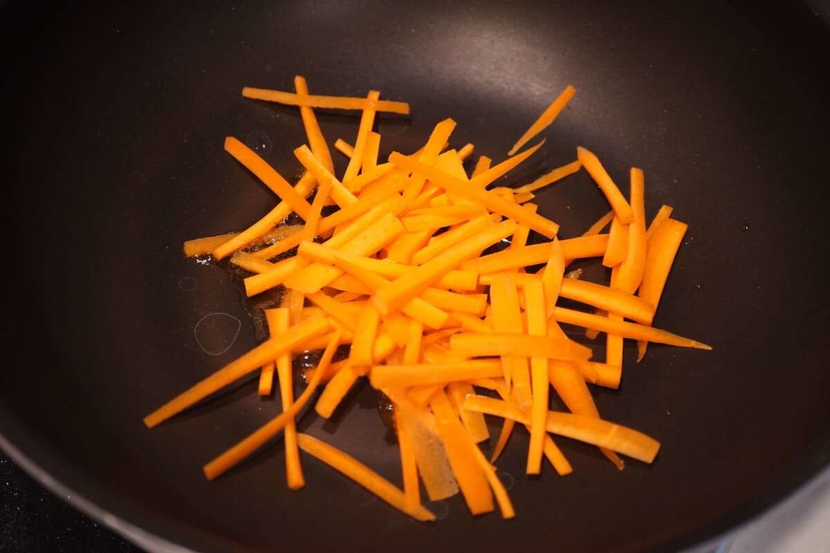 にんじんをさっと炒め、水大さじ1を加え、ふたをして中火でやわらかくなるまで2分ほど蒸します。
