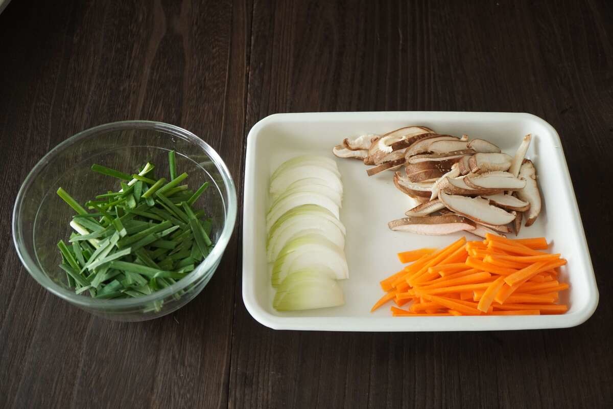 にんじんは細切り、玉ねぎは縦薄切り、にらは5cm長さに切ります。