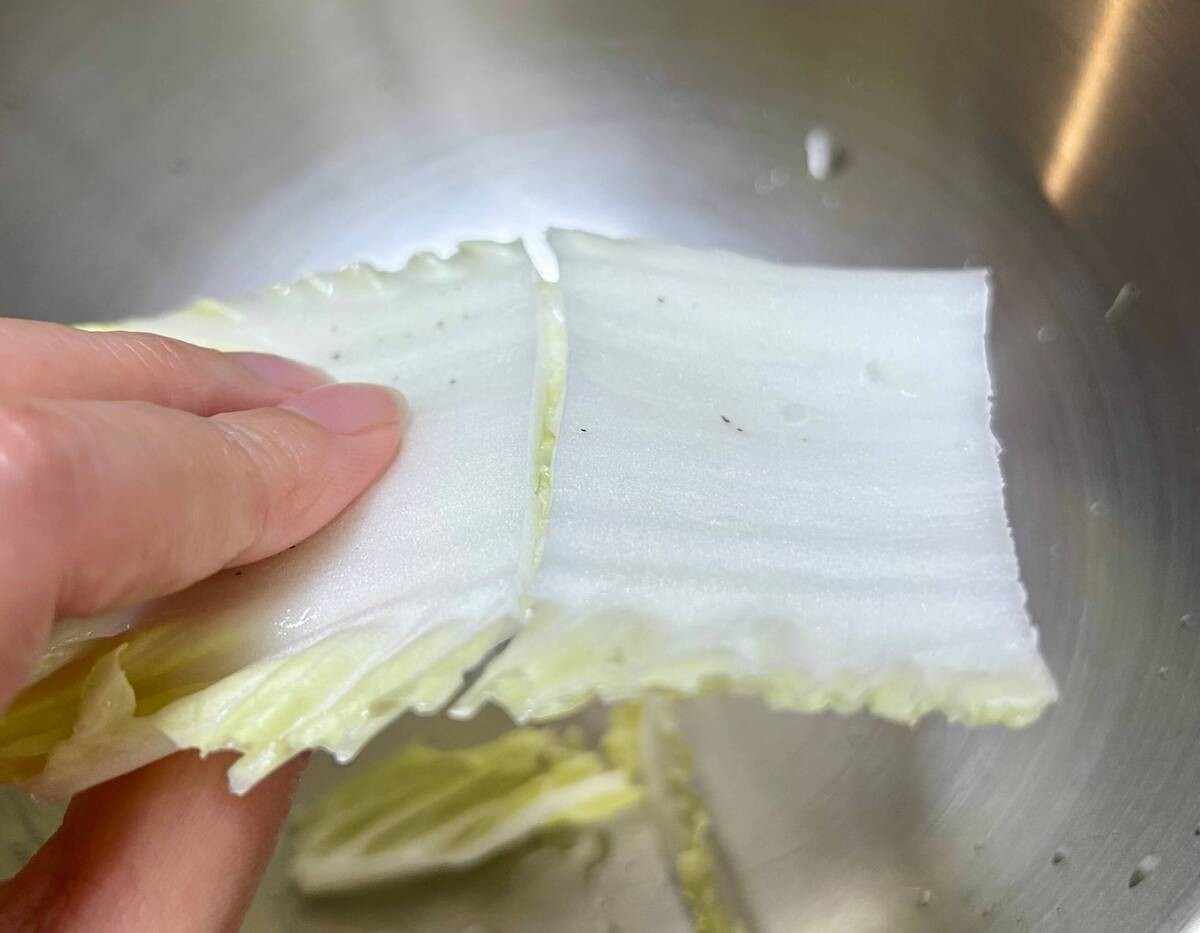 特に芯の部分はかたいので、白菜がカーブしている方向とは逆向きに、軽く折り曲げるようにしてちぎるのが最大のコツです!