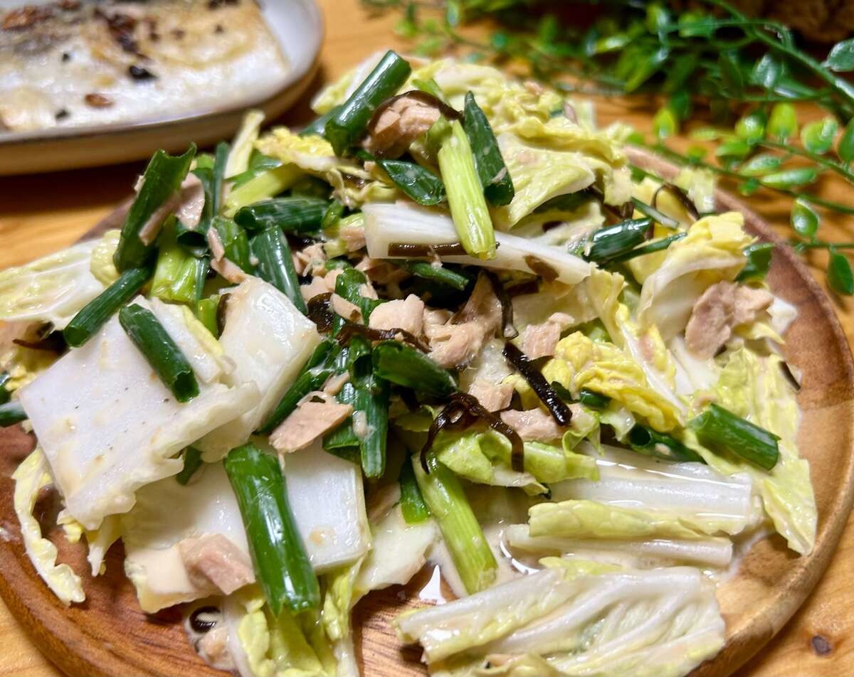 作り方③白菜と小ねぎにツナ缶と塩昆布を加える