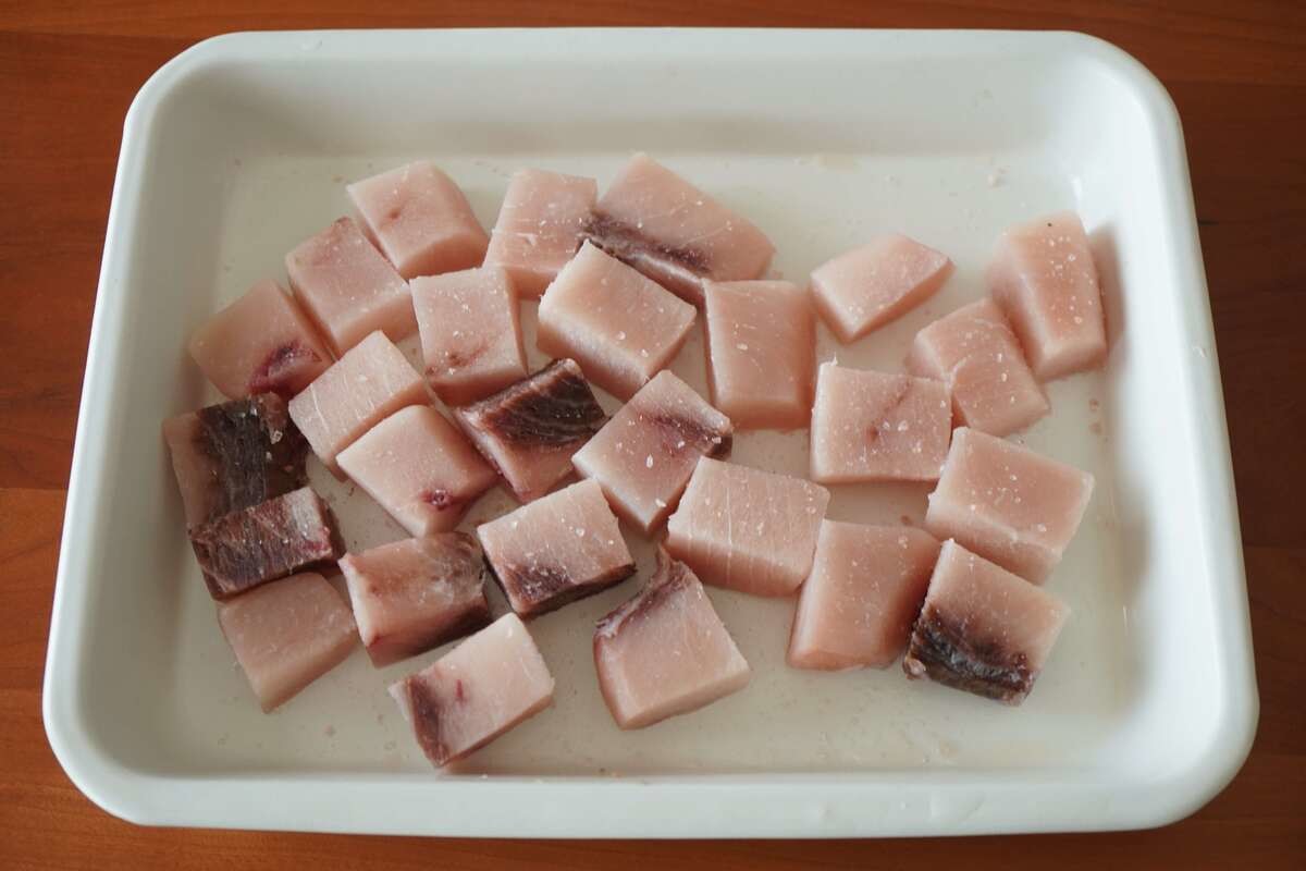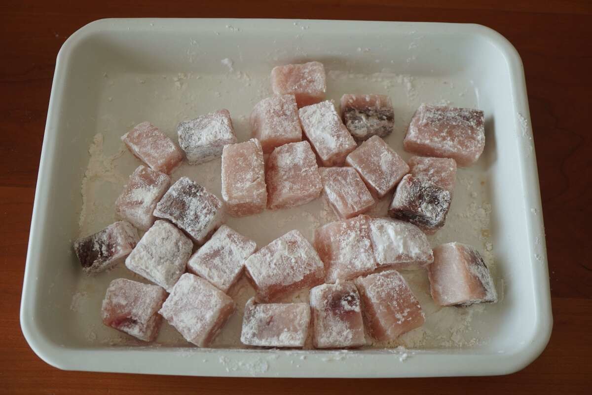 小麦粉と片栗粉を混ぜ、下ごしらえしたメカジキにまぶします。