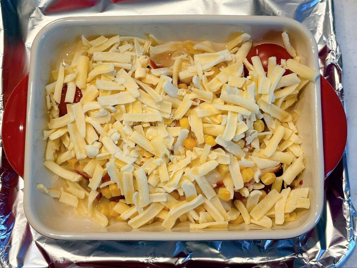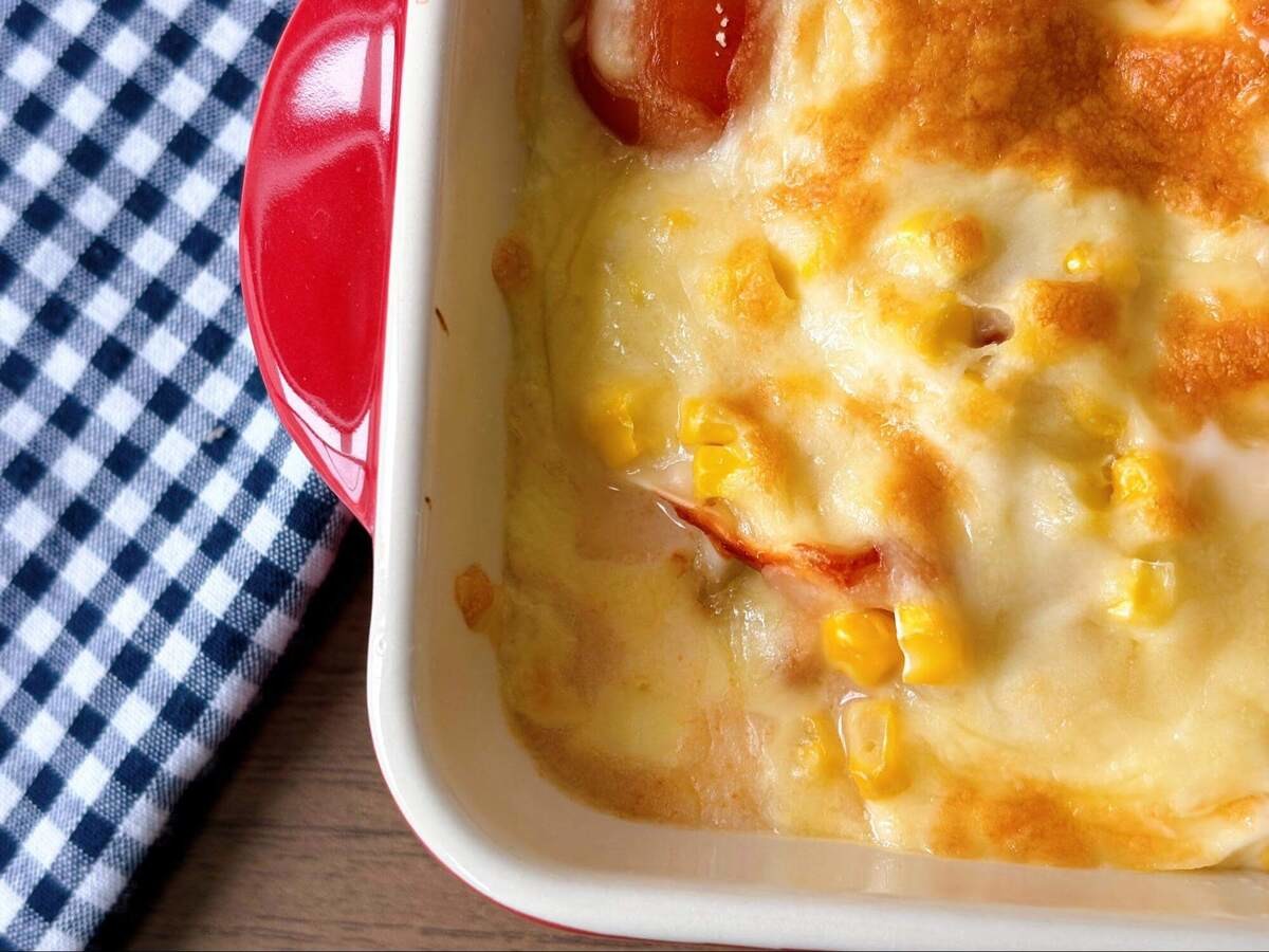 ホワイトソースをかけて、冷凍コーン、へたを取ったミニトマト、とろけるチーズをのせます。チーズに色がつくまでオーブントースターで7〜9分ほど加熱したら完成です。
