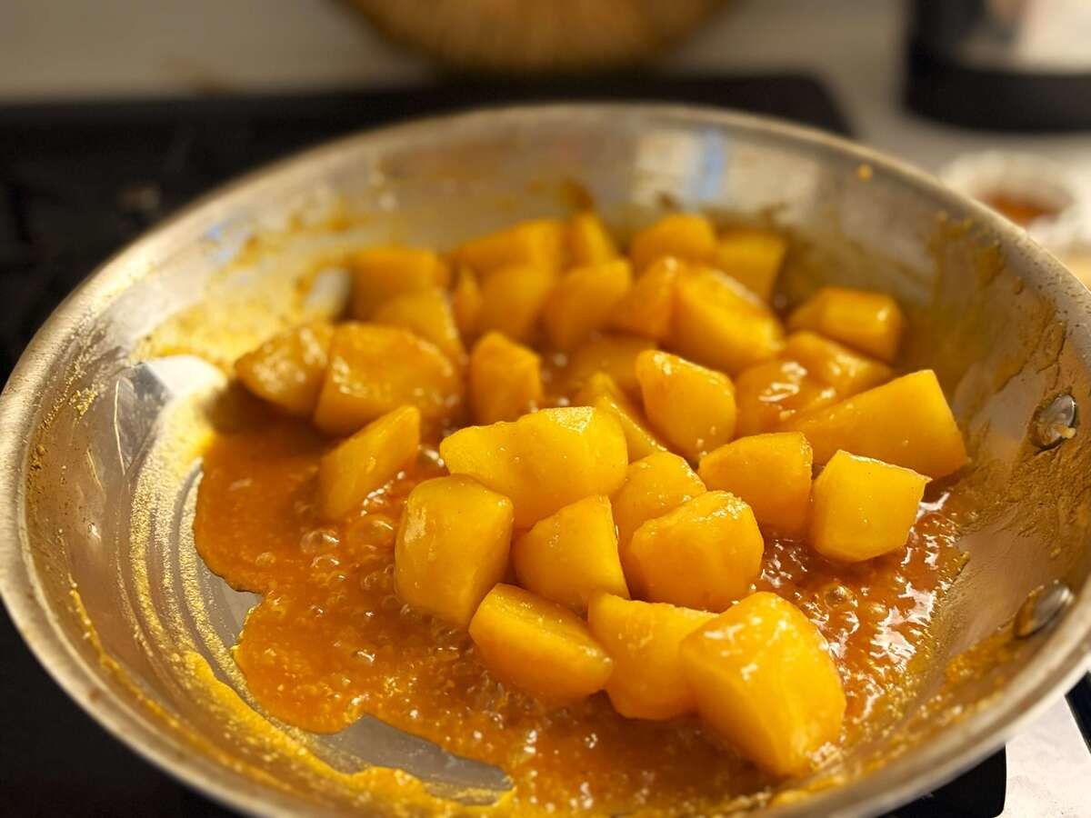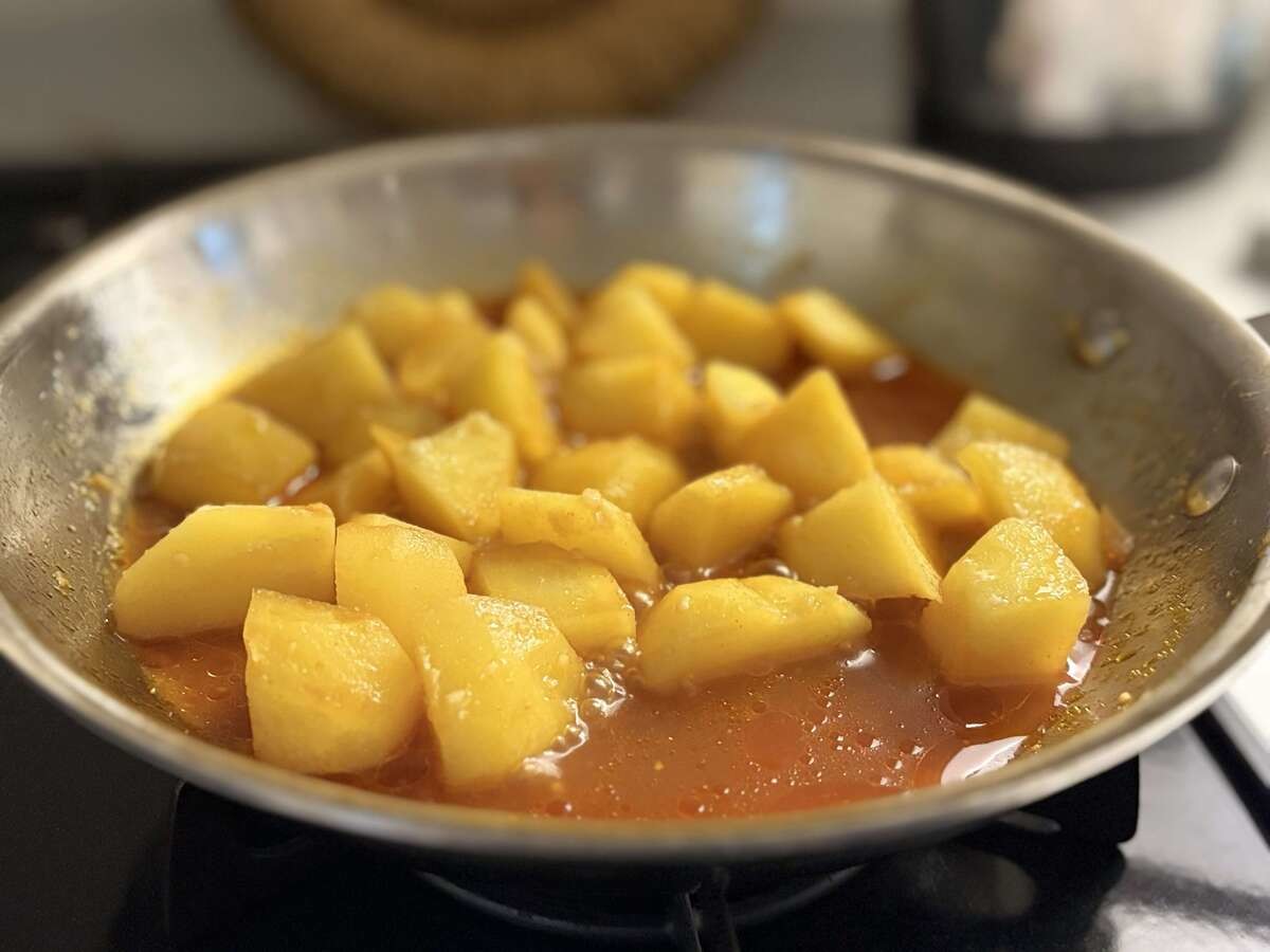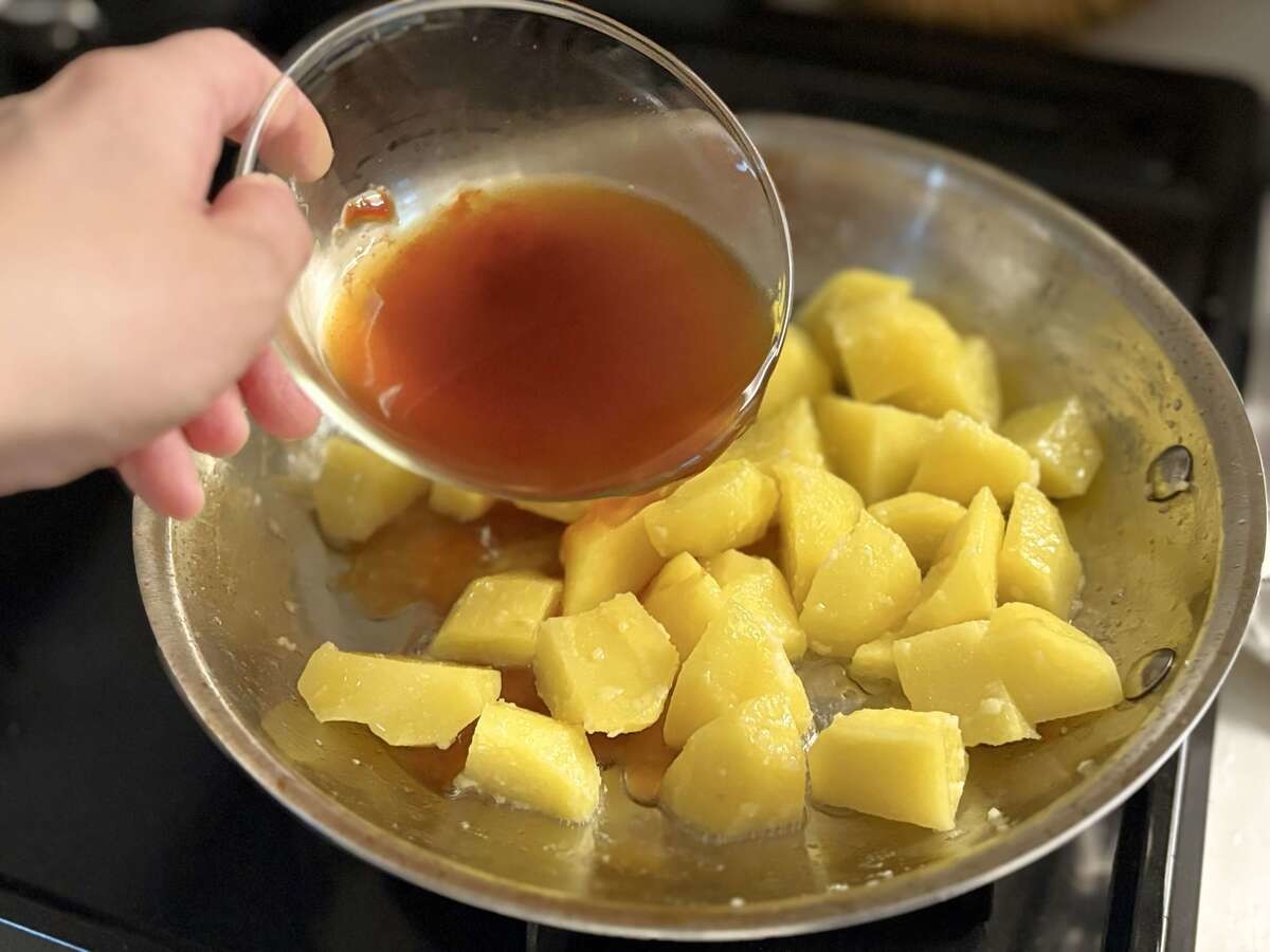 最初はしゃばしゃばとして水気が多くて心配になりますが、じゃがいもが崩れない程度に時々まぜながら中火くらいにあげて火にかけ続けていると次第に水分が飛んで、タレがトロっとしてじゃがいもにしっかりと絡み始めます!