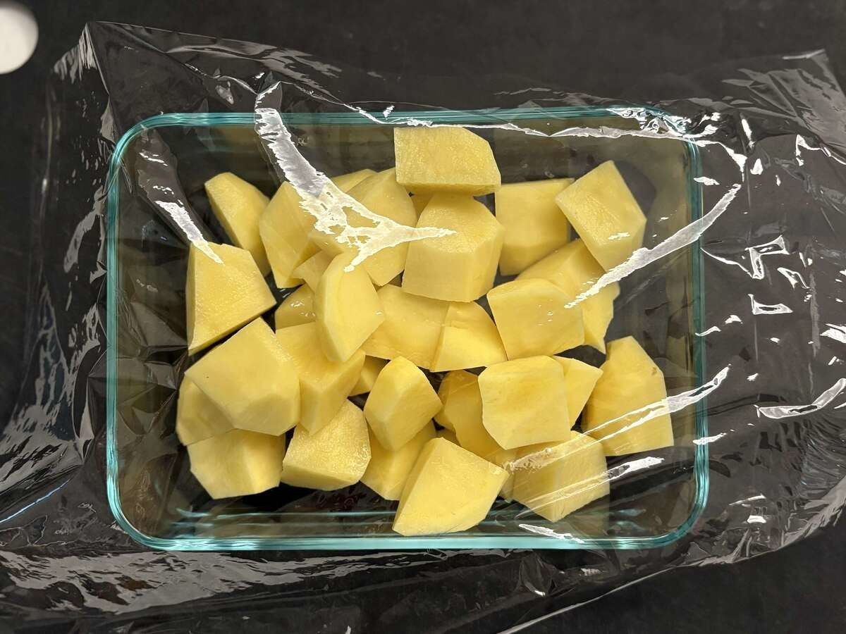 耐熱容器にじゃがいもを入れてふんわりとラップをかけたら、600Wの電子レンジで5分加熱します。