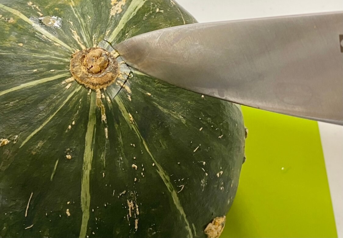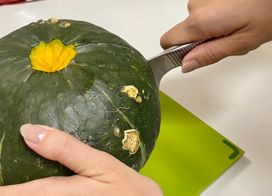 差し込む中心部分はかぼちゃの果肉であるため、包丁がスッと入り込んでくれますよ!
