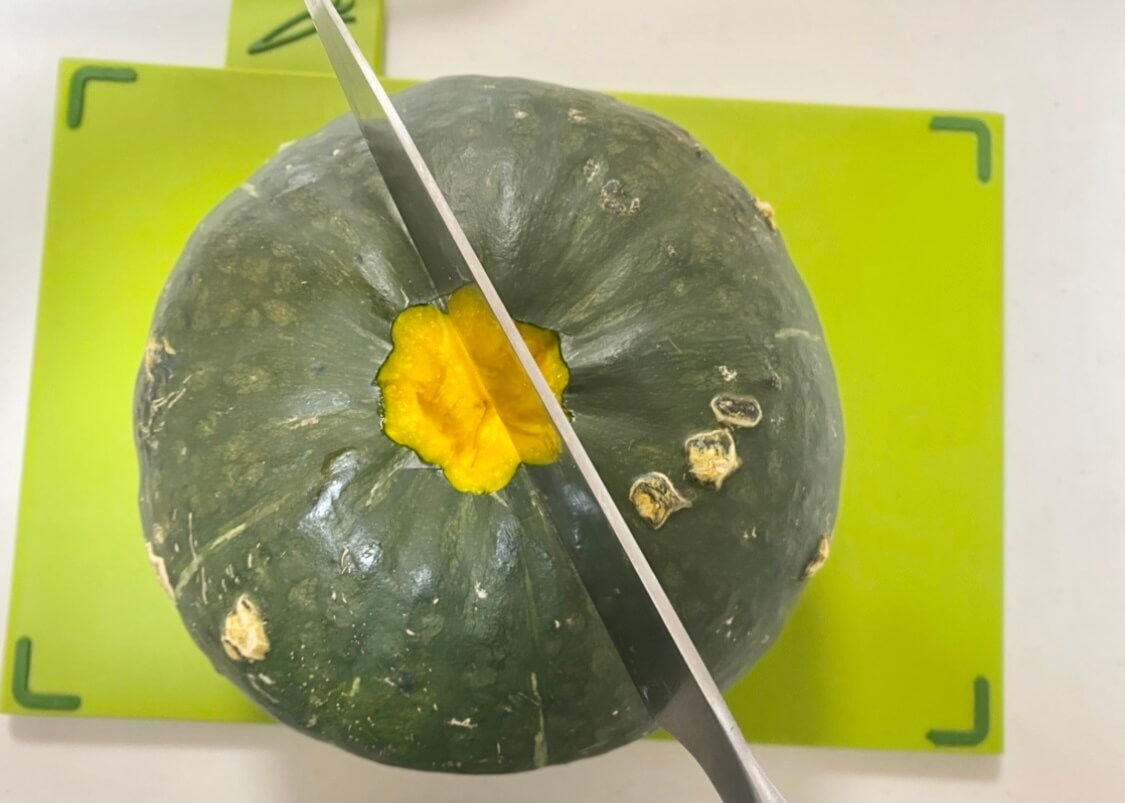 硬いかぼちゃを切る際は、包丁の向きを"垂直"に突き立てて切ることがポイントです♪