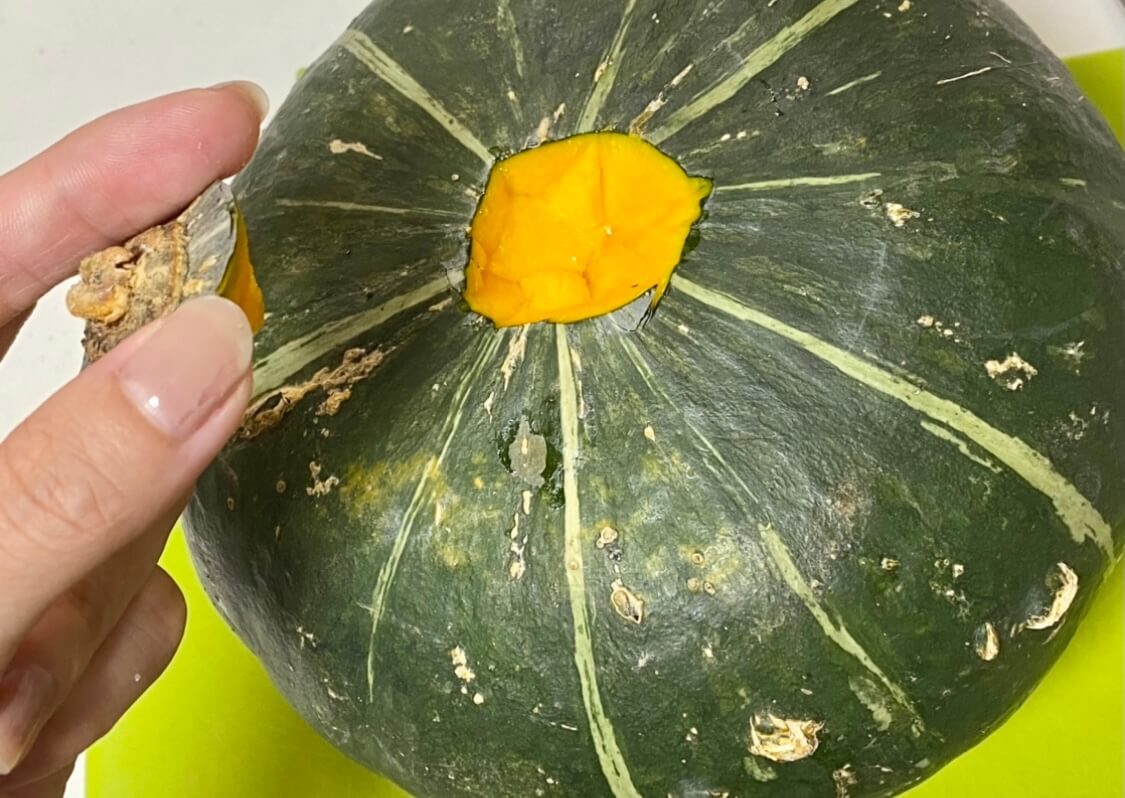 かぼちゃの切り方①ヘタと反対側の中心部を両方ともくり抜く