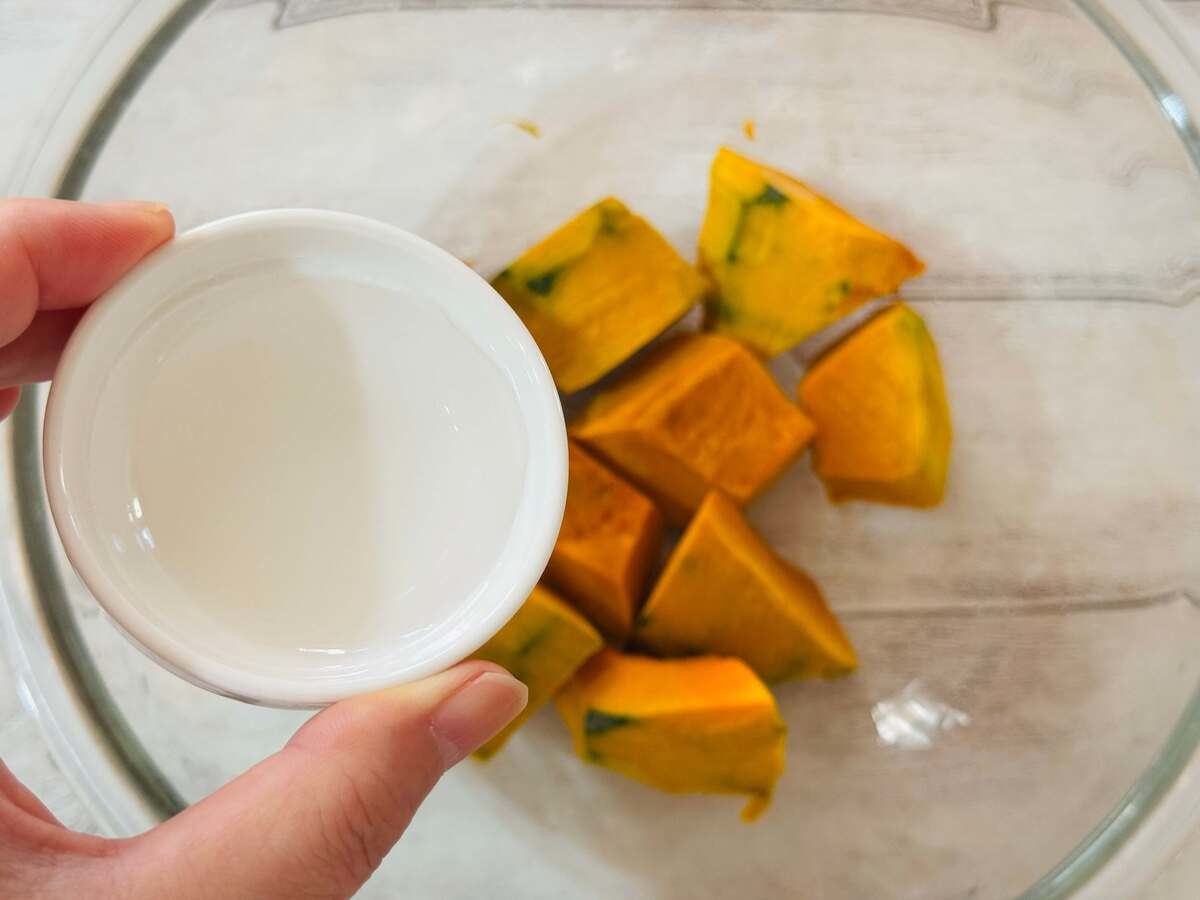 カットしたかぼちゃを耐熱ボウルに入れたら、水大さじ2をかけます。