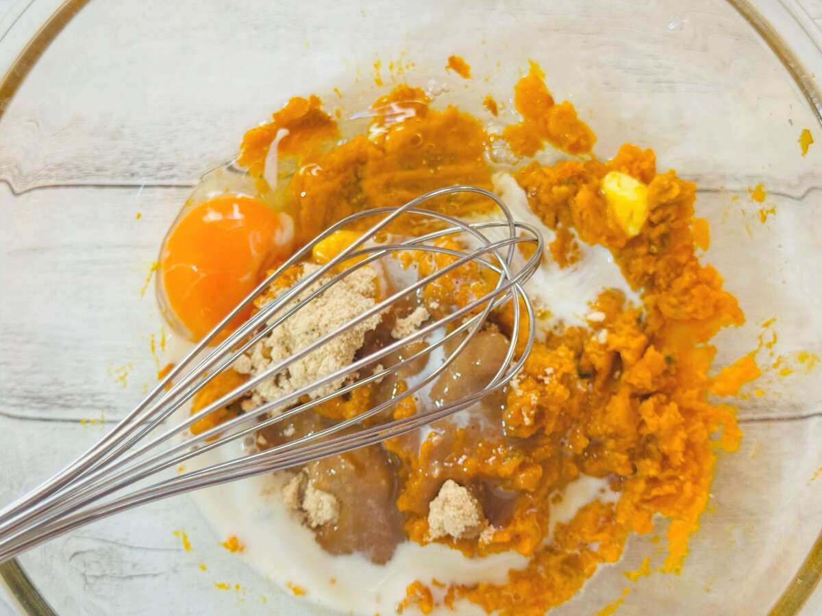 なめらかになったかぼちゃにバター、砂糖、卵、牛乳の順に加えて泡立て器でよく混ぜます。 この時点でもうおいしそうな香りがして味見したくなりますが、ぐっとガマン(笑)。
