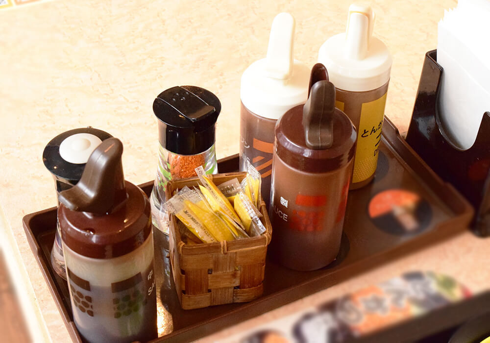 ちなみに、卓上調味料として、醤油やソース、七味唐辛子、からしなどがあります。色々試してみてくださいね。