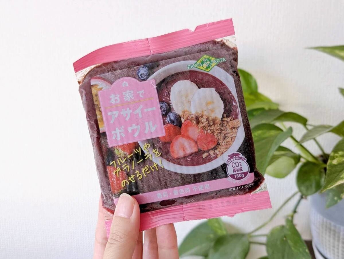 対して「お家でアサイーボウル」はすでにバナナやストロベリーなどがミックスされている状態なので、軽く溶かして手もみするだけでOK。アサイーボウル作りのハードルがものすごく下がるんです。