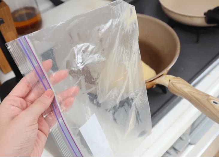 チャック付き保存袋の角をハサミで切ったら、フライパンにギュッと絞るようにして出します。