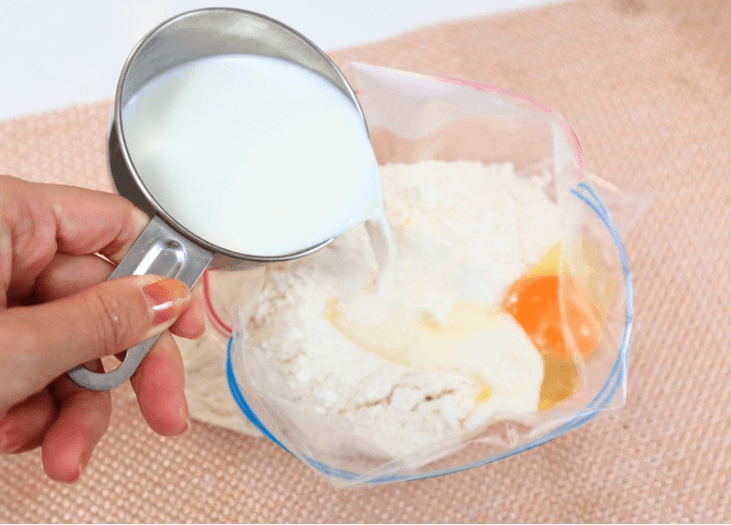チャック付き保存袋の中にホットケーキミックス・卵・牛乳を入れます。