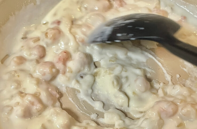 ここで焦がしてしまうと、白いグラタン部分が茶色になってしまうので、弱火でじっくり焦がさないように炒めてくださいね!