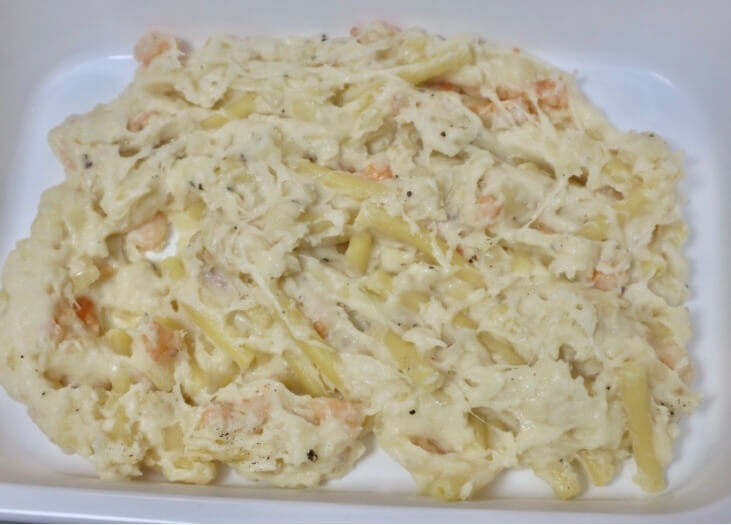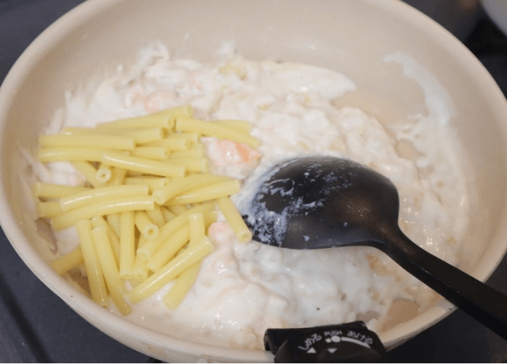 最初に茹でておいたマカロニを加えたら、ピザ用チーズも投入して混ぜ、塩・胡椒で味を調えましょう。
