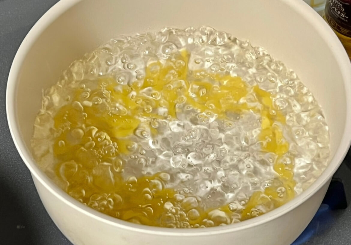 180℃に熱した揚げ油で、3~4分ほどきつね色になるまで揚げます。