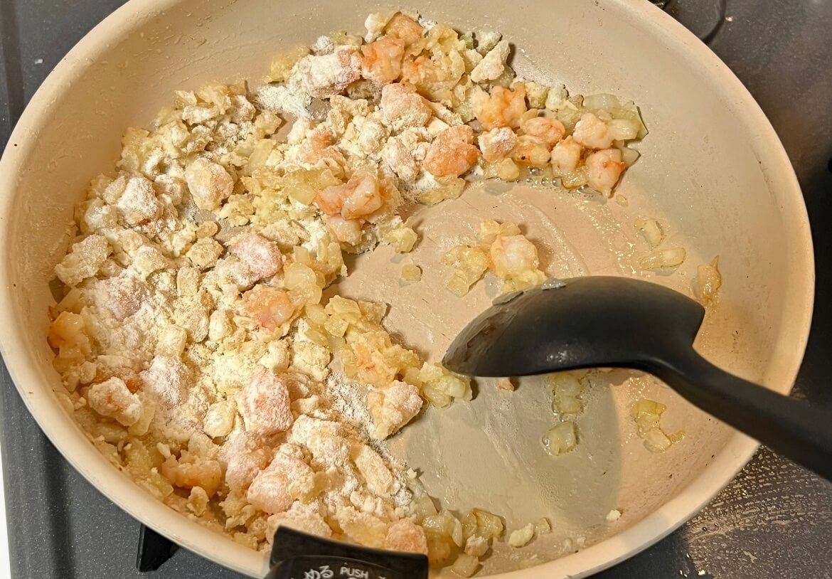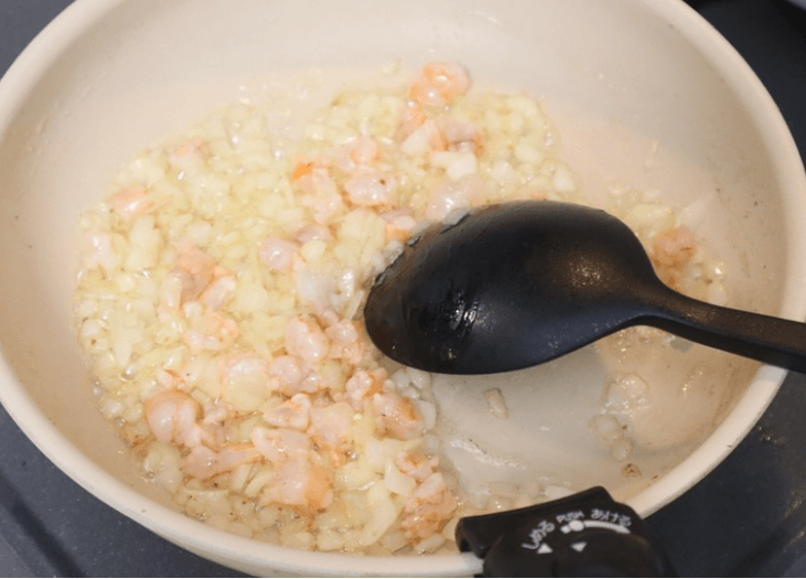 フライパンにバターを溶かしたら、塩少々(分量外)を入れて玉ねぎを弱火で炒め、透き通ってきたらえびも加えて軽く炒め合わせましょう!