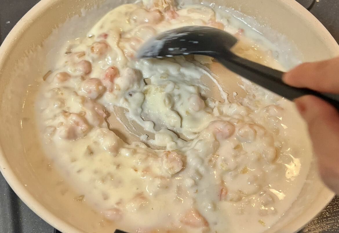 あまりホワイトソースを1から作ることがないので「この量の薄力粉に対して牛乳の量が多いのでは?」と思ったのですが、よく混ぜていくうちにとろみがしっかりとついて美味しそうなホワイトソースに♪