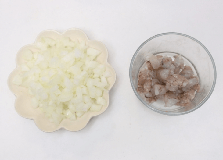 玉ねぎはみじん切りに、えびは細かく切っておきます。