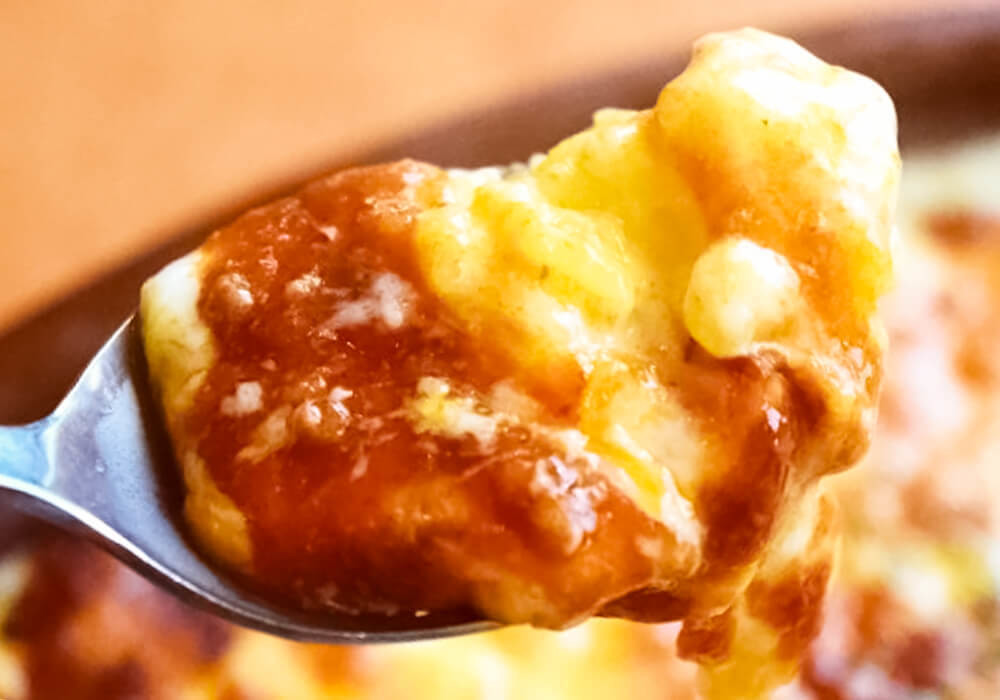 見てください、このチーズの盛り具合!表面は少し焼けていて、スプーンを入れるとところどころパリッとし、ほどよくチーズが伸びます。
