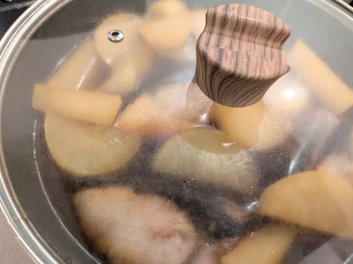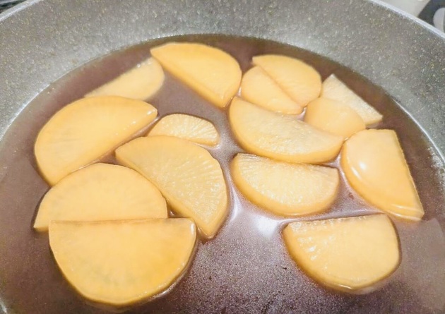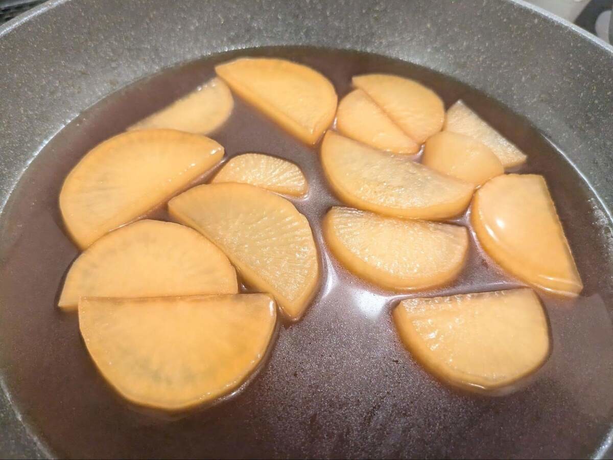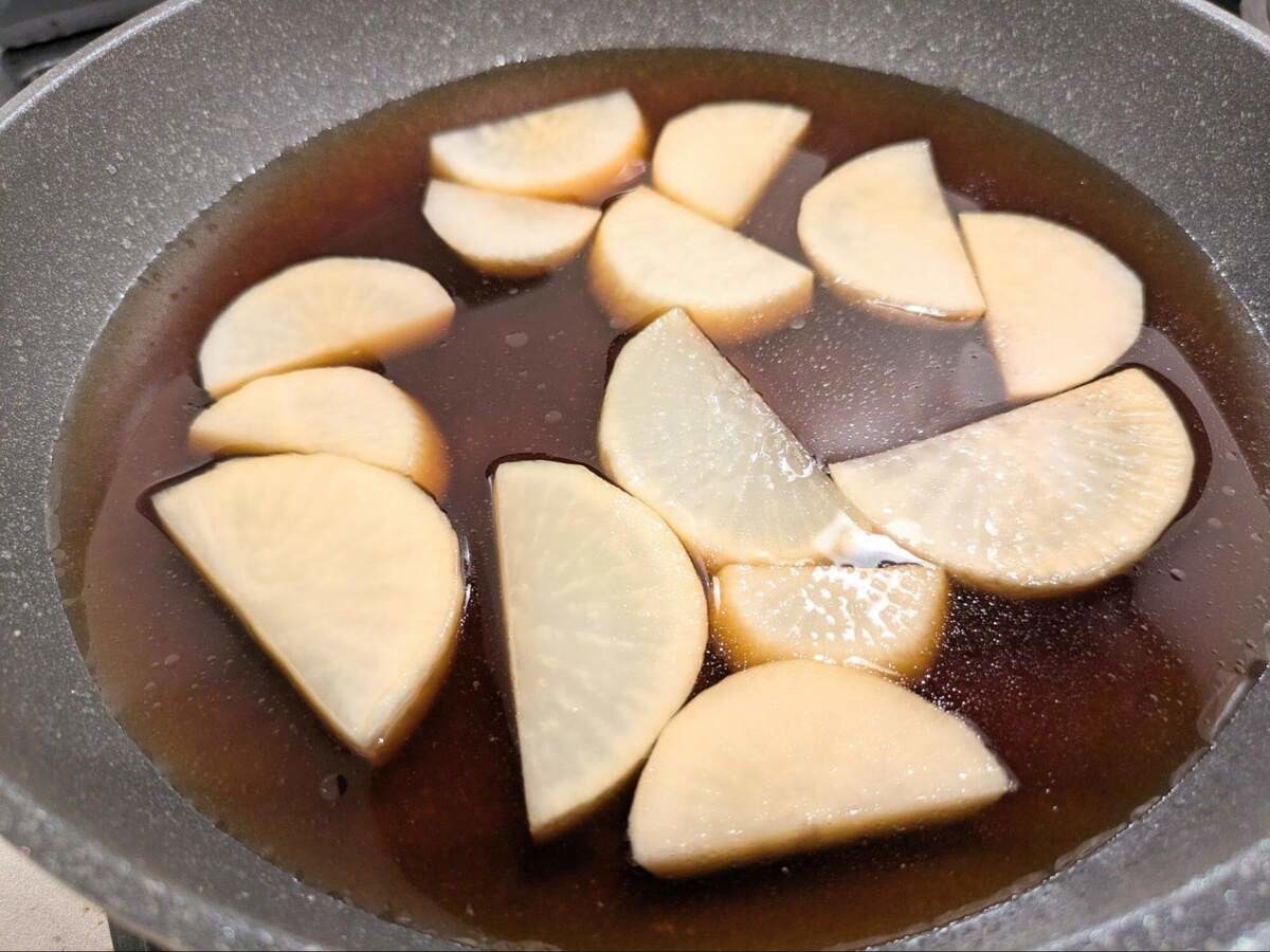 番組では大根をレンジ加熱するときに使用した昆布もフライパンに入れて煮汁として使用していました。今回は昆布とお米は煮汁には使用せず、茹で汁のみを入れました。