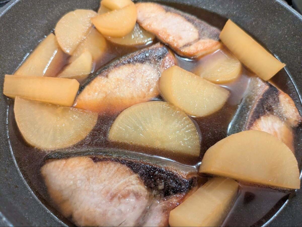 大根に煮汁がしみたら、ブリを入れましょう。火を止めてフタをし、余熱で味をなじませます。