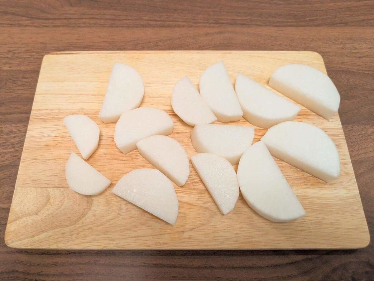 大根を2cm幅に輪切りにしましょう。皮をむいて、半分にカットします。