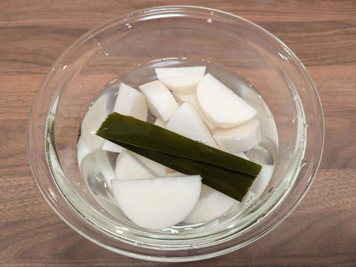 耐熱容器にカットした大根、大根が浸るくらいの水、米、出汁昆布を入れます。600Wの電子レンジで8〜10分程度加熱します。