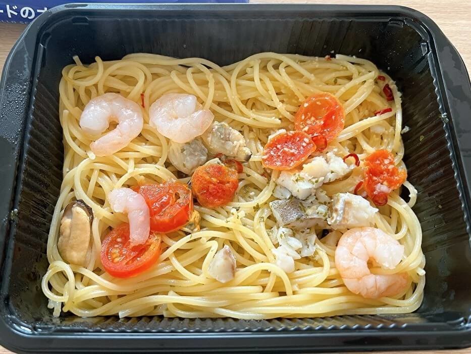できあがりがこちら。ビニールを開けると、食欲をそそるガーリックの匂いが一気に広がります。そして、シーフードがたっぷり!