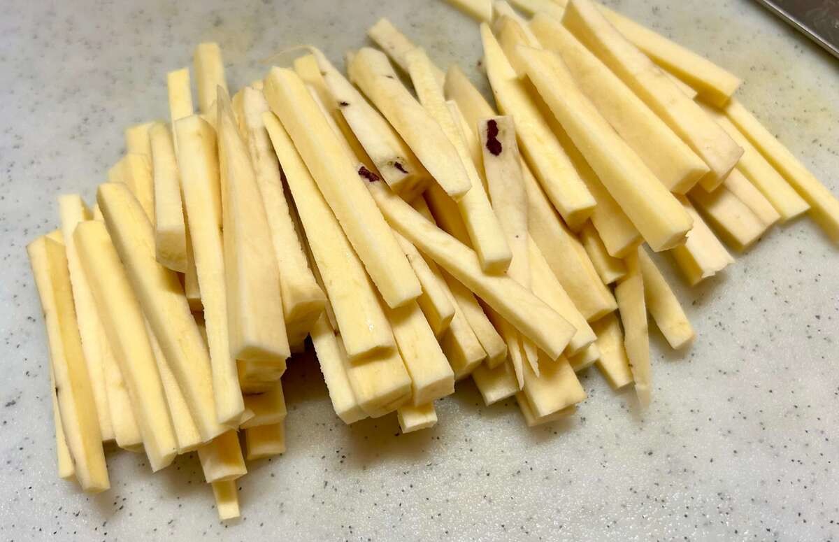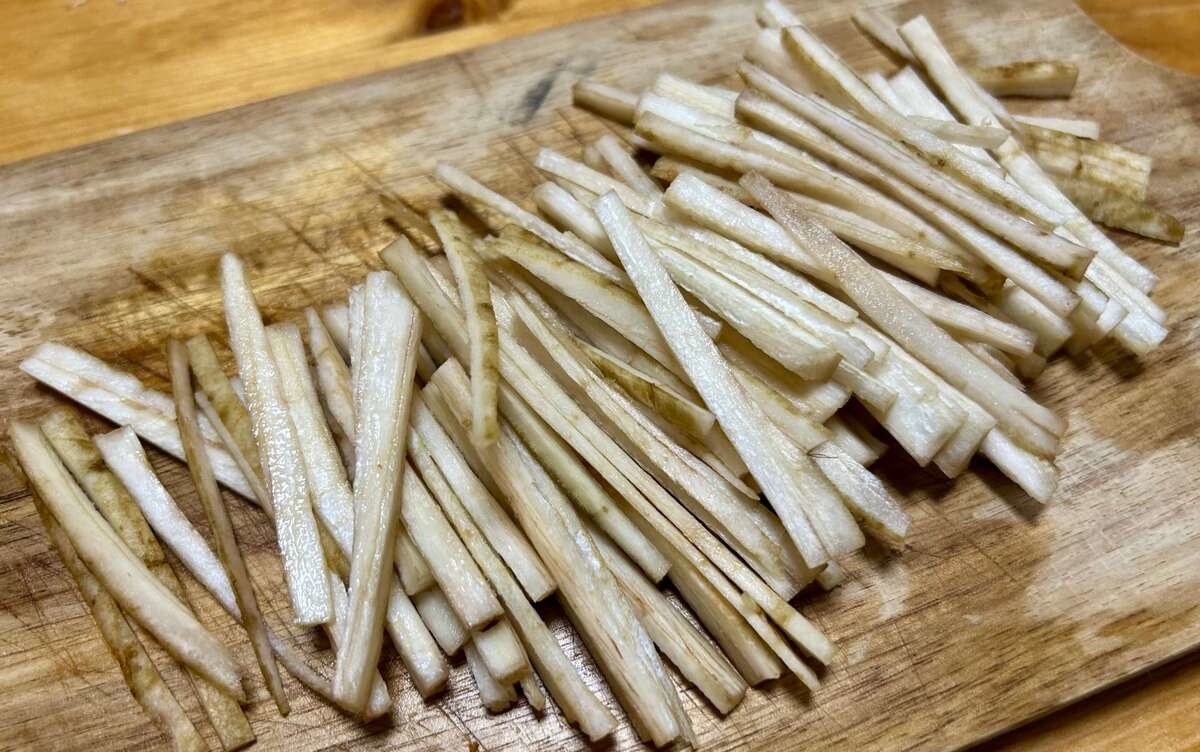ごぼうは千切りに、さつまいもは皮をむいて細切りにして、
