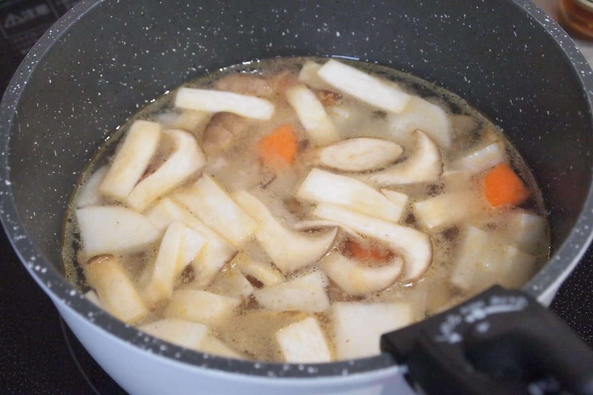 全体に油がまわったら、水(500ml)と顆粒出汁を加え、蓋をして7分ほど煮込みます。