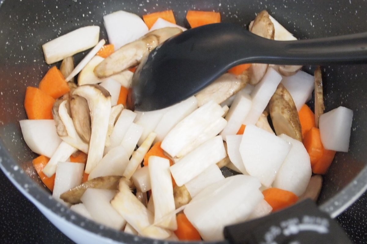 今回作る豚汁のポイントは、先に野菜だけを炒めて、お肉は後から加えてサッと火を通すこと!