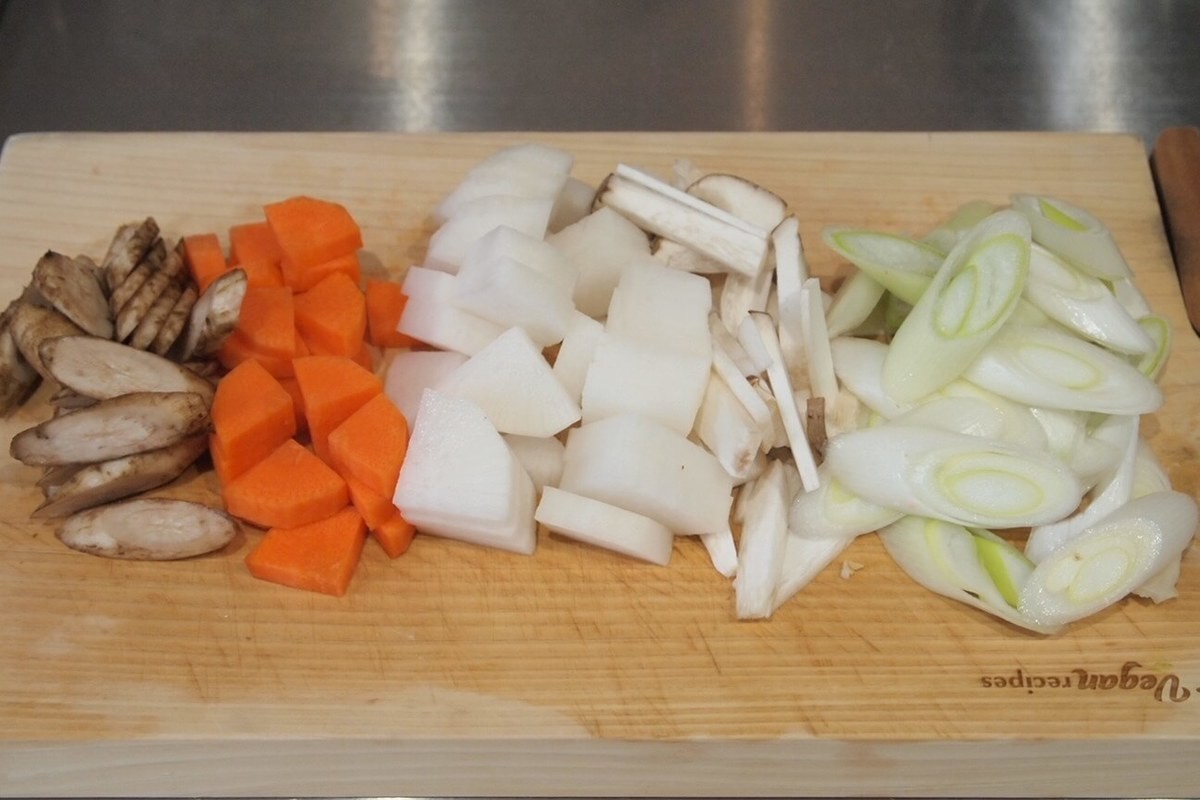 にんじん、大根は5ミリ程度のいちょう切りに。長ネギとゴボウは斜めにカット。エリンギは5ミリ程度の薄切りにしておきます。