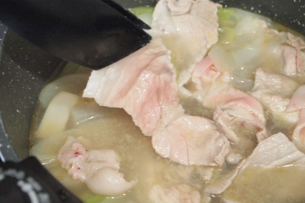 一般的な豚汁は、お肉を最初に炒めてから野菜を加えて煮込むことが多いかと思います。しかし、この方法だと、お肉に火が入り過ぎて硬く仕上がってしまうんです。