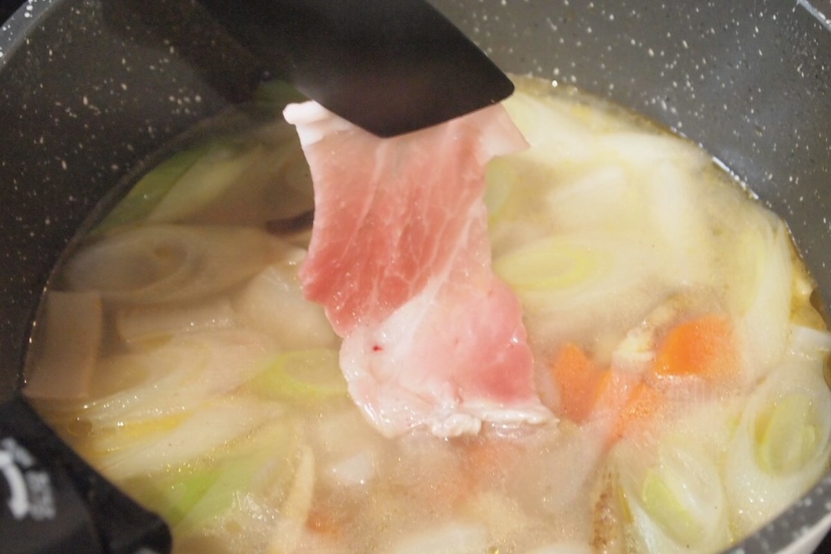 火の通り加減をちょっと気にするだけで、簡単に安い豚肉でもやわらかいお肉の豚汁が作れちゃいます。