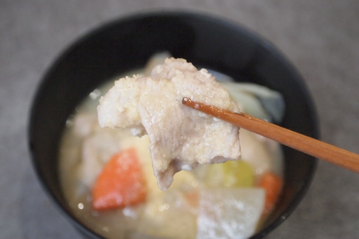 豚汁の豚肉はギュッと固くなっているのが当たり前のようなイメージだったのですが、今回作った豚汁のお肉はびっくりするほどやわらかい。