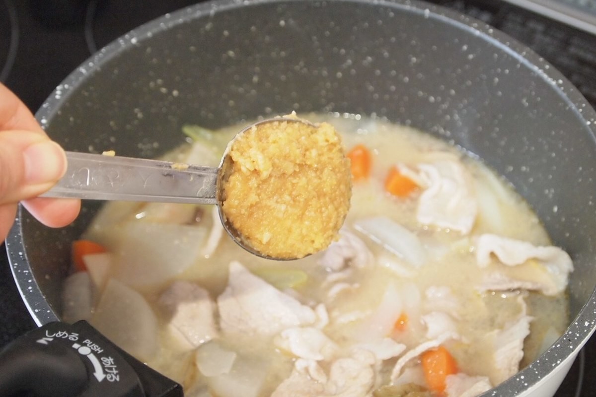 お肉の色が変わったら、味噌を溶き入れて完成です。