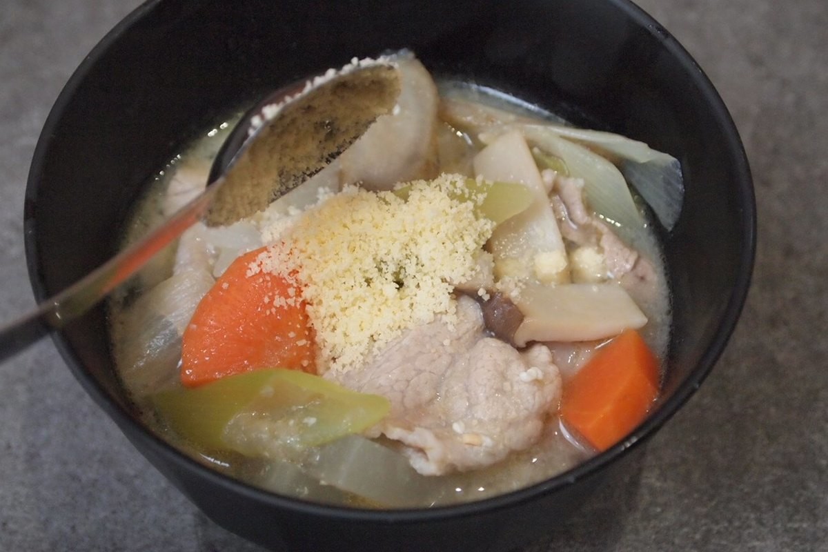 粉チーズ(1人前あたり小さじ1~2杯)を豚汁に振りかけて、軽く混ぜたら完成です。