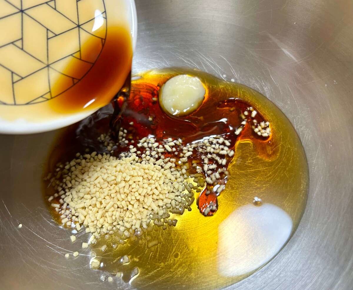 ボウルに鶏がらスープの素、にんにく、しょう油、ごま油を入れて、混ぜます。