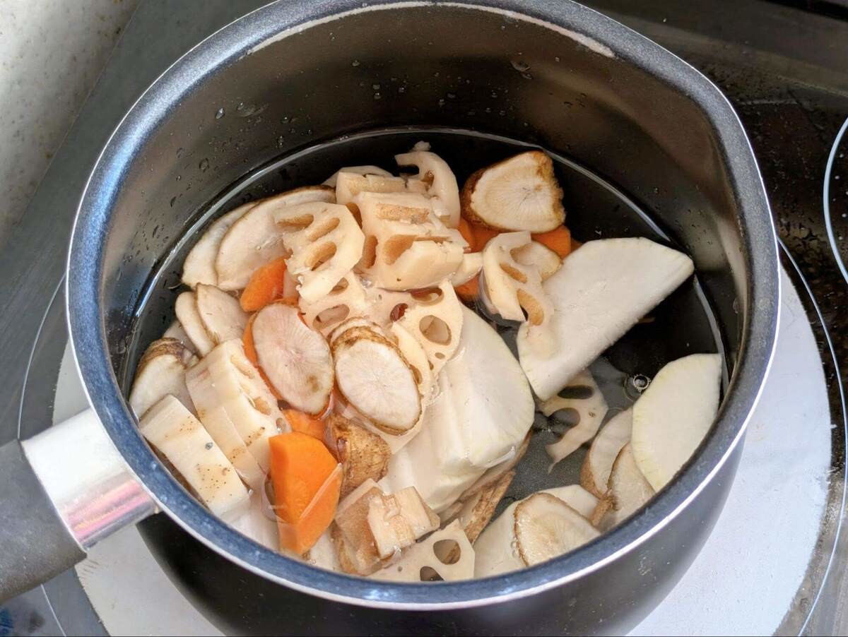 アクが出ていますが取らなくても大丈夫。ごぼうやれんこんのアクは栄養も旨みもたっぷりなので、楽できておいしく食べられて一石二鳥です。