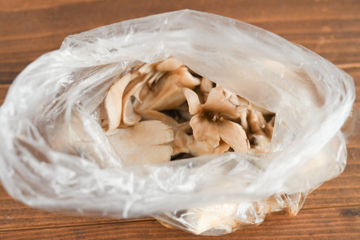 片栗粉を入れて袋をふるようにして舞茸に片栗粉を絡めます。