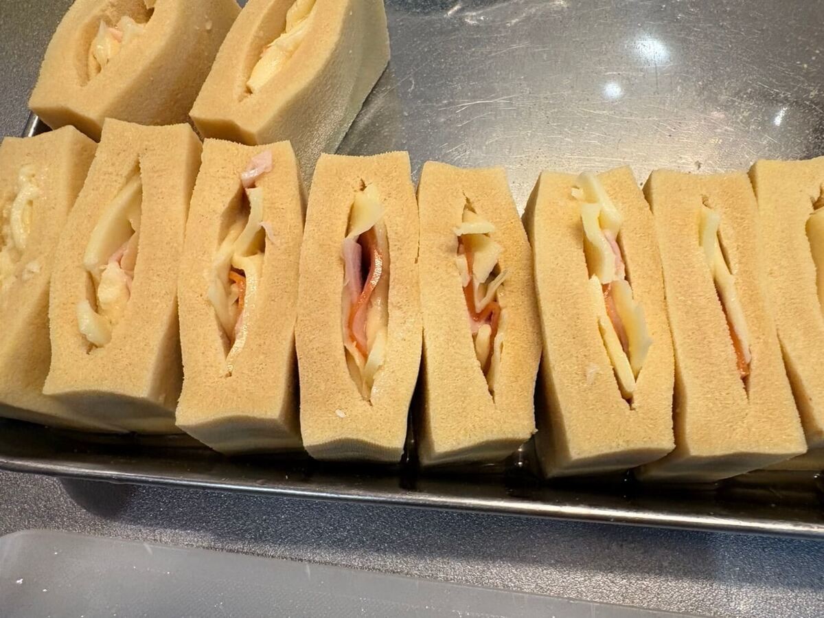 ハムは1枚を6等分(2枚で12個)、チーズは1枚を4等分(3枚で12個)に切ります。